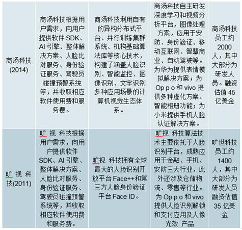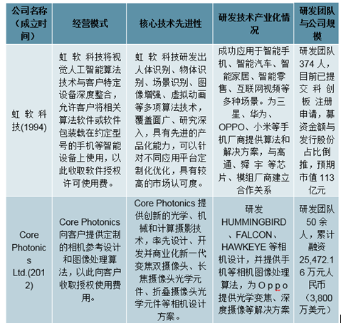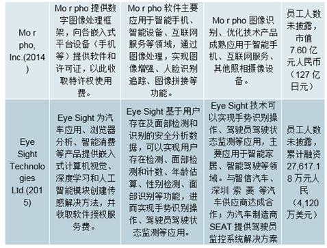 现有主要的视觉人工智能企业中,虹软科技注重研发视觉人工智能底层算法,主要提供智能手机、智能汽车、物联网(IoT)设备及智能保险的视觉人工智能解决方案;商汤科技专注于构造算法平台,研发底层算法技术的工程化应用;旷视科技主要在安防、金融、零售、汽车、教育等领域提供软硬件一体化的解决方案;CorePhotonicsLtd.和Morpho,Inc.主要从事摄像领域的视觉人工智能算法,提供手机、相机、汽车等摄像头设备的智能解决方案;EyeSightTechnologiesLtd.专注于增强车辆、家居和消费电子产品中的用户体验,主要提供智能汽车、智能家居等领域的视觉人工智能解决方案。