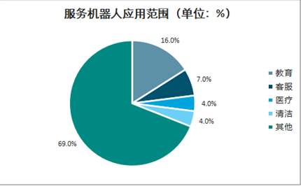 服务机器人是庞大机器人家族中的一个年轻成员,到目前为止尚没有一个严格的定义。根据其用途不同,可以划分为保洁机器人、教育机器人、医疗机器人、家用机器人、服务型机器人及娱乐机器人,应用范围非常广泛。目前,教育机器人市场份额约为16%,客服机器人份额约7%,医疗、清洁用服务机器人占比均在4%左右。