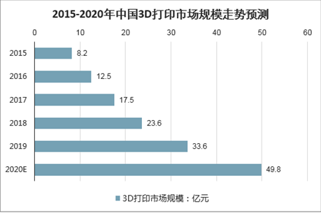 全球3D打印正火热,由于中国引进3D打印技术较晚,与国外有一定差距,但近年来也得到快速发展。目前,中国的3D打印应用主要集中在家电及电子消费品、模具检测、医疗及牙科正畸、航空航天等领域,未来将向医疗、建筑等更广的应用场景发展。2019年中国3D打印市场规模约为33.6亿元。伴随着中国3D打印技术的相应成熟,在航天航空,汽车等行业需求将持续增加,预计2020年中国3D打印市场规模将近50亿元。
