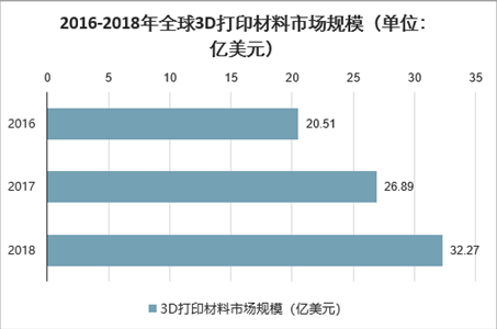 2017年全球3D打印材料市场规模约为26.89亿美元, 2018年全球3D打印材料市场规模达到32亿美元。随着3D打印技术应用领域的不断拓展和越来越多的3D材料面世,全球3D打印材料市场将会继续保持稳定增长的趋势。
