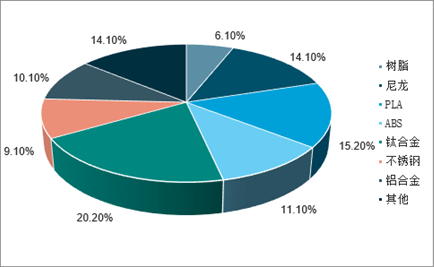 由于3D打印材料的下游应用主要为装备制造业,因此应用的3D打印材料主要为金属类材料,包括钛合金、铝合金、不锈钢及其他金属材料,金属类材料合计占比超过40%;另外,工程塑料ABS、尼龙、PLA等主流3D打印材料占比也在10%以上。