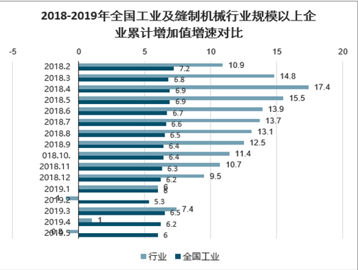 2018-2019年全国工业及缝制机械行业规模以上企业累计增加值增速对比