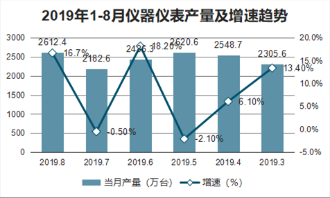 2019年1-8月仪器仪表产量不断增加,2019年6月产量2436.3万台,同比增加18.2%,2019年1-8月累计产量19220.2万台,累计增长3%。