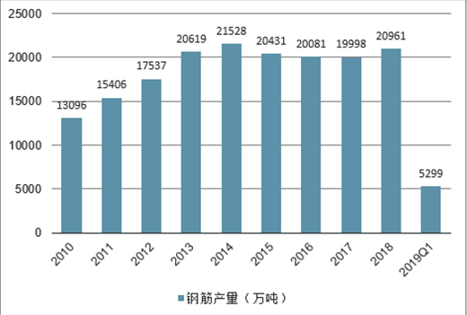 2019年一季度,全国钢筋累计产量为5299.0万吨,同比增长12.8%。