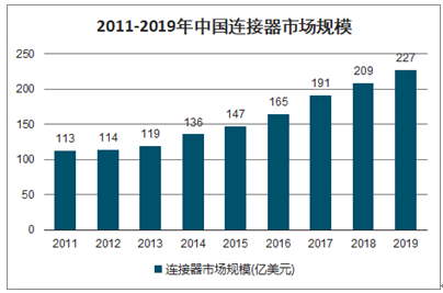 近年来,中国经济保持持续快速增长,在中国经济高速发展的带动下,通信、交通、电脑、消费电子等连接器下游市场也取得了快速增长,直接带动我国连接器市场需求急剧增长,2011年到2019年,中国连接器市场规模由113亿美元增长到227亿美元。