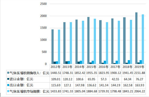 2019年我国气体压缩机行业销售收入约2151.88亿元,进口金额约76.27亿元,出口金额163.93亿元,国内气体压缩机行业市场规模2064.22亿元,如下图所示: