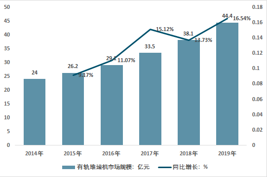 随着各大物流快递企业陆续登陆资本市场,纷纷加强对运输能力、智能化处理能力及科技信息化投入,智能仓储物流的布局是主要表现形式,目前,仓储、配送一体化已经成为物流、电商仓储的发展趋势。此外,在人力成本上升、土地资源有限、经济转型升级等背景下,许多制造业企业开始以物流端为切入点进行自动化转型升级。有轨堆垛机产品市场规模高速增长,2019年我国有轨堆垛机行业市场规模44.4亿元,同比2018年的38.1亿元增长了16.54%,近几年我国有轨堆垛机行业市场规模情况如下图所示: