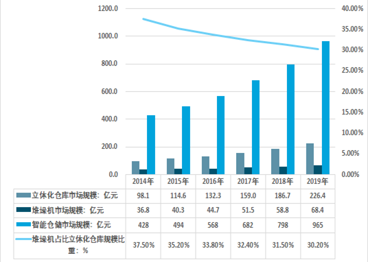 2014-2019年中国堆垛机行业规模及占比立体仓库规模比重
