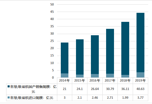 2019年我国有轨堆垛机行业市场规模44.4亿元,其中,有轨堆垛机进口规模3.77亿元;有轨堆垛机国产销售规模40.63亿元。