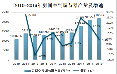 中国房间空气调节器产量呈现缓慢上升的趋势,2010年中国房间空气调节器产量为10887.47万台。2019年产量达到21866.2万台,同比实现4.3%的增长。
