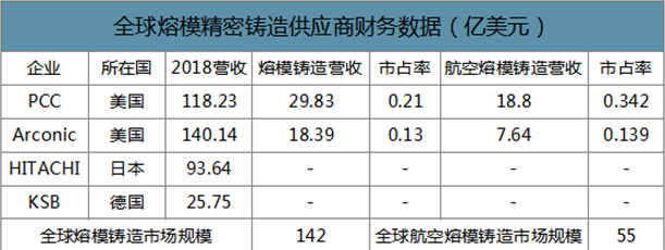 国际主要两机厂商为改变长期以来极少数高温合金叶片供应商垄断局面,正积极培育引入新的合格供应商,以丰富供应商体系,打造更加充分的公平竞争环境,增强供应链安全性。全球两机高温合金叶片供应商呈现垄断局面,全球仅少数如PCC、Arconic等厂商。2018年,全球精铸龙头PCC航空熔模铸造营收达到18.8亿美元,市占率达到34.2%;Arconic营收达到7.6亿美元,市占率达到13.9%。全球航空熔模铸造市场被头部企业垄断,甚至压缩了下游主机厂商的议价空间。GE、RR、西门子等全球两机巨头近年来都致力于培养新的精铸叶片供应商,以增加供应链的柔性与安全性。