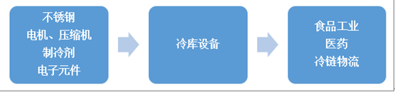 冷库是指用人工手段,创造与室外温度或湿度不同的环境,也是对食品、液体、化工、医药、疫苗、科学试验等物品的恒温恒湿贮藏设备。冷库设备行业上游主要为不锈钢、电子元件、电机、压缩机以及制冷剂等行业,上游产业为冷库设备提供所需的原材料供给。冷库设备行业下游主要集中在食品工业、医药以及冷链运输等领域。