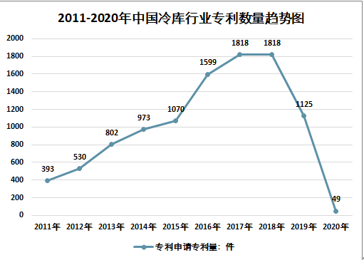 据统计,从2011-2020年中国冷库行业专利申请数量总共达到10177件,其中2018年达到行业最高峰值为1818件,近两年冷库行业专利申请数量略有下降趋势。