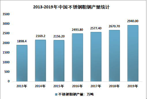 我国不锈钢产量近些年保持良好的增长趋势,2013-2019年我国不锈钢粗钢产量复合增长率7.56%。2019年,不锈钢粗钢产量2940.0万吨,增长了10.08%。