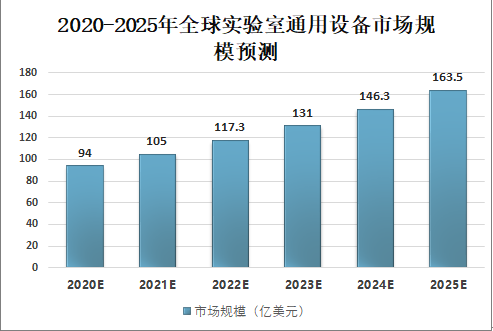 2014年全球实验室通用设备市场规模近49亿美元,2015年达到54亿美元,预计2020年其市场规模将达到94亿美元,复合增长率预计为11.7%。按照此复合增长率推算,预测2025年全球实验室通用设备市场规模将达163.5亿美元。