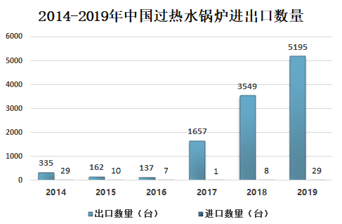 2019年中国过热水锅炉出口数量为进口数量的179倍,2019年过热水锅炉出口数量为5195台,进口数量为29台。