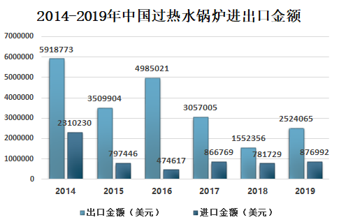 2018年中国过热水锅炉出口金额为1552356美元,进口额为781729美元;2019年中国过热水锅炉出口金额为2524065美元,进口额为876992美元。