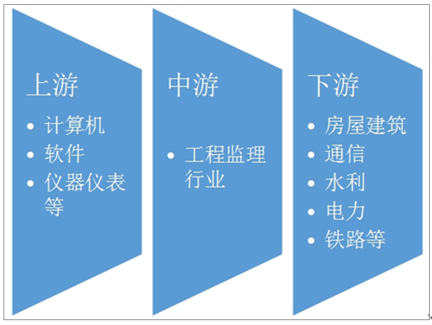 工程监理行业上游行业主要为办公用品、计算机及系统软件、检测仪器等,均为充分竞争行业,价格比较稳定,市场供应充足。工程监理行业下游十分广泛,主要包括房屋建筑、通信、水利、电力、铁路等行业。