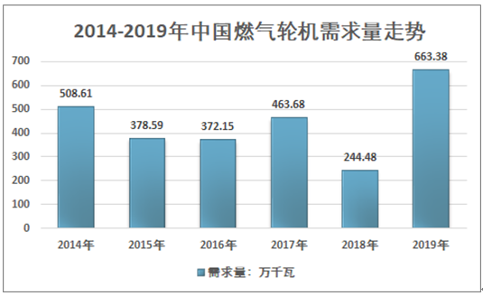 据统计2018年我国燃气轮机需求量为244.48万千瓦,2019年我国燃气轮机需求量为663.38万千瓦。
