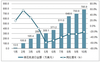 2019年1-10月中国绣花机累计进口金额及增速趋势图