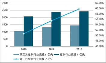 2016-2018年中国第三方检测行业规模及占比检测比重情况