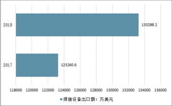 2017年我国焊接设备出口额为123260.6万美元,2018年我国焊接设备出口额为133288.2万美元,同比增长8.14%。