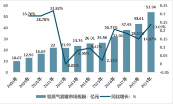 2019年我国铝质气雾罐市场规模为53.94亿元,较2018年的43.61亿元增长23.69%。