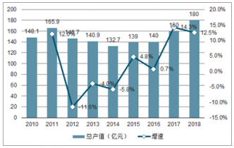 2010-2018年中国袋式除尘行业总产值及增速趋势