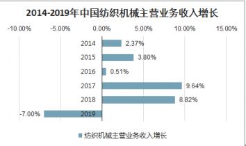 2014年中国纺织机械主营业务收入增长2.37%,到2017年达到9.64%,2018年8.82%,有所下降。2019年度,受中美贸易摩擦等因素影响,我国纺织机械行业主营业务收入较之前年度有所下滑。2019年度,我国纺织机械行业营业收入819.52亿元,同比减少7.00%;利润总额达58.67亿元,同比减少3.60%。