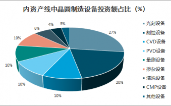 内资产线中PVD设备投资额占比约为10%。晶圆制造设备约占半导体设备投资额的80%,而成膜设备则占晶圆投资设备的20%,一般来说PVD设备与CVD设备占比接近(各10%)。