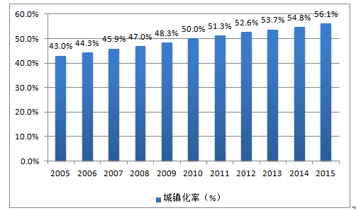 在人口总量在不断增加的同时,我国城镇化的步伐 也在不断加快。2001-2010年城市化水平明显加速,十年间城市化率从36%上升至50%左右,高于 世界银行公布的2009年中等收入国家城市化水平 (48%),与美国20年代、日本50-60年代的城市 化水平相当。2015年末,中国大陆总人口137462 万人,城镇常住人口77116万人,城镇化率为 56.10%,比上年提高1.33个百分点。随着我国城市建设的推进,城镇化率从 2005 年的 43%增长到 56.1%,“十三五”规划中指出到 2020 年,我国城镇化率要达到 60%。