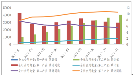 2017年1-11月,全国电力供需总体宽松,全社会用电量累计增速同比提高。全社会用电量累计57331亿千瓦时,同比增长6.5%,增速比上年同期提高1.5个百分点。分产业看,1-11月份,第.一产业用电量1074亿千瓦时,同比增长7.1%;第二产业用电量40185亿千瓦时,同比增长5.5%;第三产业用电量8054亿千瓦时,同比增长10.5%;城乡居民生活用电量8018亿千瓦时,同比增长7.7%。