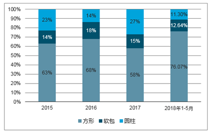 根据统计,2019年1-5月份,中国动力电池装机量达12.66Gwh,其中软包动力电池装机量达1.43Gwh,市场占比达11%;方形电池装机量达9.63Gwh,市场占比达76%;圆柱电池装机量达1.60Gwh。