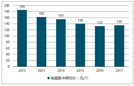 近年来,国内电磁脉冲阀产品价格整体呈现下降态势,从2012年的185元/个下降到2017年的135元/个,如下图所示: