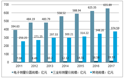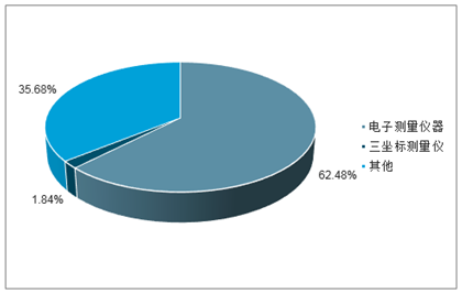 2017年电子测量仪器占我国测量仪器市场规模的62.48%,三坐标测量仪占1.84%,其他测量仪器规模占35.68%。