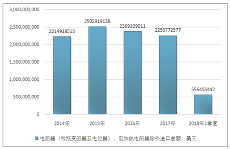 2016年我国电阻器(包括变阻器及电位器),但加热电阻器除外进口总额2369109011美元,2017年进口总额2250772577美元;2019年1季度进口总额556455442美元。
