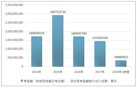 2016年我国电阻器(包括变阻器及电位器),但加热电阻器除外出口总额1690597380美元,2017年出口总额1432482508美元;2019年1季度出口总额348680913美元。