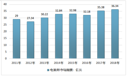 2018年我国电阻焊行业市场规模约36.34亿元,同比2017年的35.38亿元增长了2.71%,近几年我国电阻焊行业市场规模情况如下图所示: