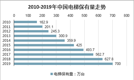 2010年我国电梯保有量162.9万台增长至2019年的近700万台,目前已成为全球电梯保有量最多的国家。