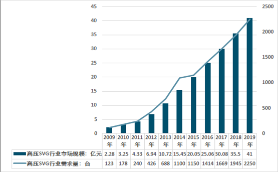 2019年国内高压SVG行业需求量约2250台,需求市场规模约41亿元,如下图所示: