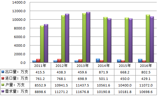2016年中国打印头行业产量约11072万支,进口量约429.1万支,出口约802.5万支,国内表观需求量约10698.6万支,如下图所示: