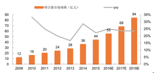 吻合器是临床手术中使用的替代传统手工缝合的设备,使用方便、缝合严密、松紧合适,且很少有副作用和手术并发症,甚至可以实现肿瘤患者的病灶切除,因此深受国内外临床外科医生的青睐和推崇。据数据统计,2016年我国吻合器市场规模约55亿元,近年来保持着高达25%的复合增长率。未来随着微创手术的逐步普及、以及医保覆盖范围的扩大,我国吻合器市场前景广阔。