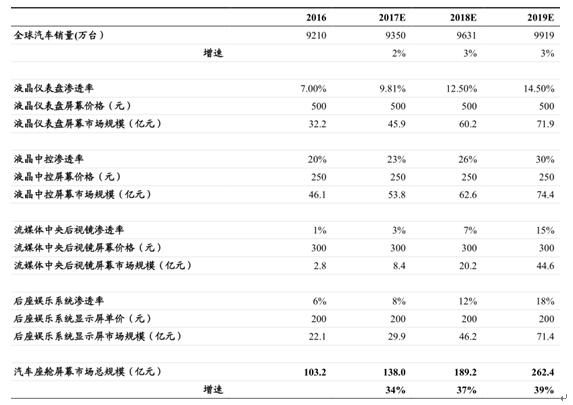 目前全液晶仪表盘一般用在高端车型上,成本价为 1500-2500 元左右,其中屏幕占总成本的 25%,预计为 500 元左右。据预估,2016年全液晶仪表盘渗透率为 7%,对用液晶仪表盘屏幕市场规模为 32.2 亿元,预计至 2019 年液晶仪表盘渗透率为 14.5%,对应市场空间为 71.9 亿元。液晶中控是车内所有屏幕中普及程度最高的,预计到 2019 年渗透率为 30%,市场规模 74.4 亿元。