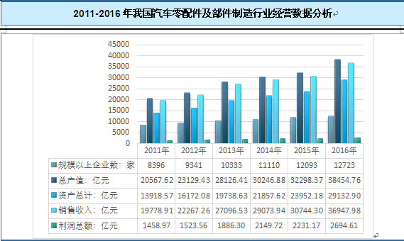 2016年我国汽车零配件及部件制造行业规模总资产达到29132.90亿元,行业销售收入为36947.98亿元,2016年行业利润总额为2694.61亿元。
