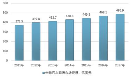 2011-2018年全球汽车延保市场规模走势图(单位:亿美元)