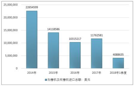 2016年我国扫雪机及吹雪机进口总额10315217美元,2017年进口总额11762581美元;2019年1季度进口总额4088635美元。