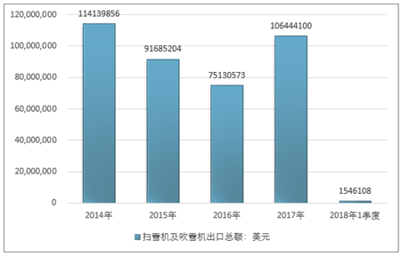 2016年我国扫雪机及吹雪机出口总额75130573美元,2017年出口总额106444100美元;2019年1季度出口总额1546108美元。