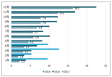 2017-2019新能源汽车月度销量快速上涨(万辆)