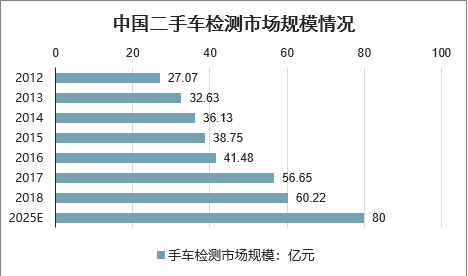 目前机动车二手车交易中发生的交易服务费、评估费实行政府指导价管理,交易服务费按不超过交易额的0.5%收取,评估费按不超过评估额的0.7%收取。按照0.7%的费率测算,中国二手车交易的检测评估费用容量目前也有60亿元的空间,且这一数据将随着二手车交易市场金额与交易量的扩大而不断扩大,预计到2025年有望超过80亿元。