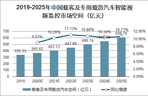 2021-2027年中国载客及专用载货汽车智能视频监控市场空间(亿元)
